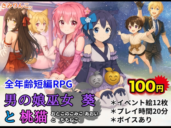 *あらすじ 男の娘巫女の白雪葵(しらゆき・あおい)。 桃栗神社(ももくりじんじゃ)にて、毎日勤務に励んでいた。 ある日、巫女長の桃栗桃(ももくり・もも)から命令を受ける。 猫と桃の遺伝子を持つ桃猫(ももねこ)を入手する巫女修行の幕開けだ。 *男の娘巫女の全年齢ほんわかストーリー 登場キャラはほぼ全員男の娘(着物か巫女装束)です。 ドキドキ要素は、抱きつかれる、見つめられる、頬にキス程度だけです。 *簡単お手軽RPG マップは3つだけで、レベル上げも不要な簡単なRPGです。 武器、防具は存在しません。 装備の概念をカットしてシンプルにしています。 戦闘よりキャラ同士のやり取りを楽しむ作品です。 *イベントCG 12枚です(差分は含めず)。 *プレイ時間 20分です。 *プレイしなくても全てのイラストを見れます このゲームにCG閲覧モードはありません。 その代わり、ゲーム内イラストは同梱の「桃猫イラスト」というフォルダに全て入っています。 |